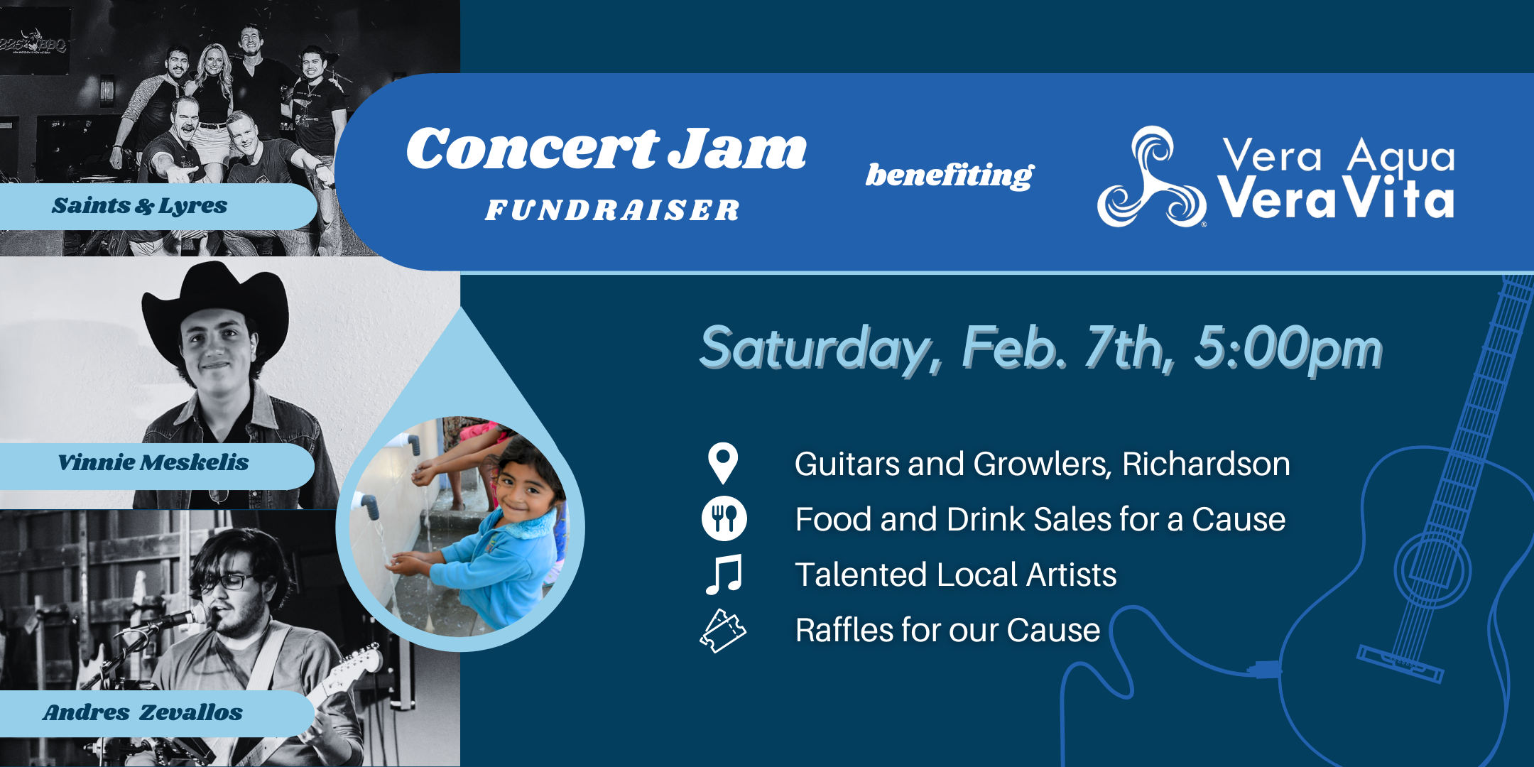 Join us in celebrating another incredible year of bringing clean water to people in need and kick off the new year by attending Vera Aqua Vera Vita's Concert Jam fundraiser! This event is a way for us to express our gratitude to the entire VAVV family and celebrate the impact of our work together.
