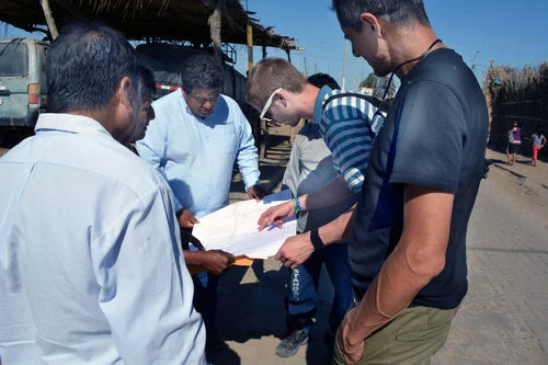 Consider becoming a Global Impact Volunteer. Executive Director Jacob Niemeier and VAVV Board Member Alberto Montoya (on right) go over plans with a team of consultants in Monte Castillo discussing the need to assess the sanitary sewer system.