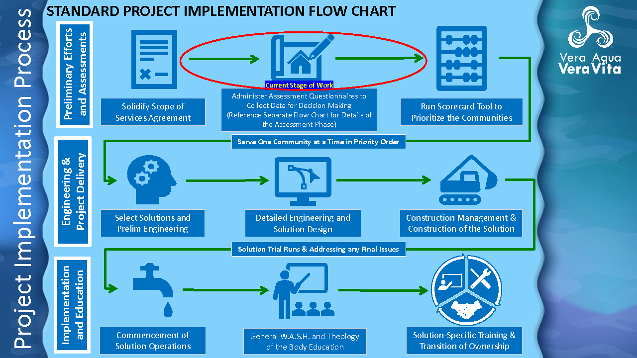 The assessment begins with the administration of questionnaires to community leaders and 10% of the households to identify the communities which are in the greatest need. The community leader’s questionnaire asks questions about the community demographics, health and sanitation practices, water sourcing, and the effects the community has experienced, if any, due to contaminated water. The household questionnaire seeks to uncover on a more individual basis what sources these houses draw water and determine what practices of sanitation are used for drinking, bathing, washing, and cooking along with how much money it costs to receive the water.