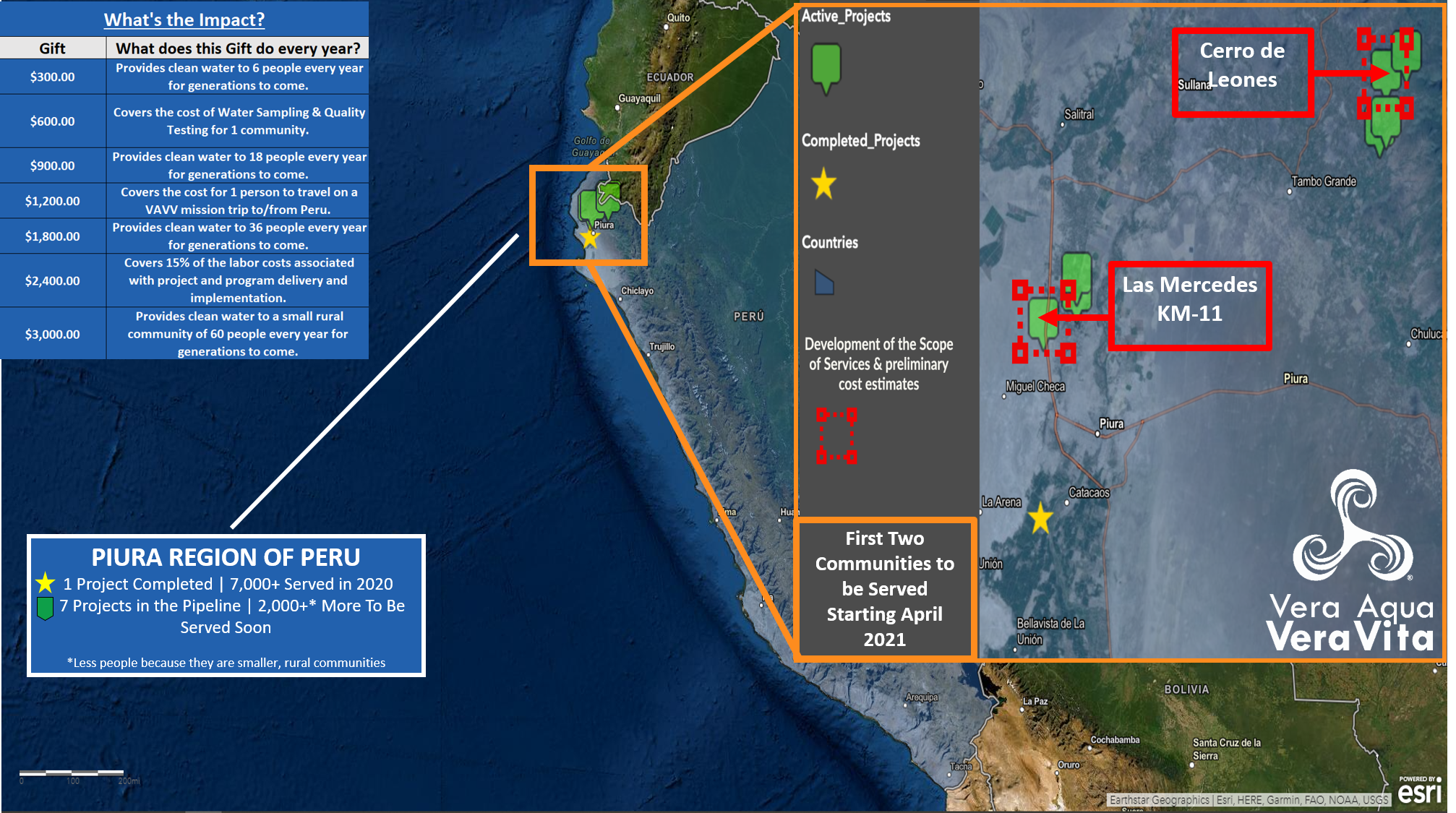Working primarily in Piura now, the future of Vera Aqua Vera Vita (VAVV) is in serving seven new communities down the line, bringing water to thousands of people for generations to come! Currently, all efforts are being channeled to serve two of these seven communities: Cerro de Leones and Las Mercedes KM11. The hope in serving only two communities instead of all seven at once is that by narrowing the spread of resources, each community’s issues and difficulties will be solved in the most effective and efficient way possible.